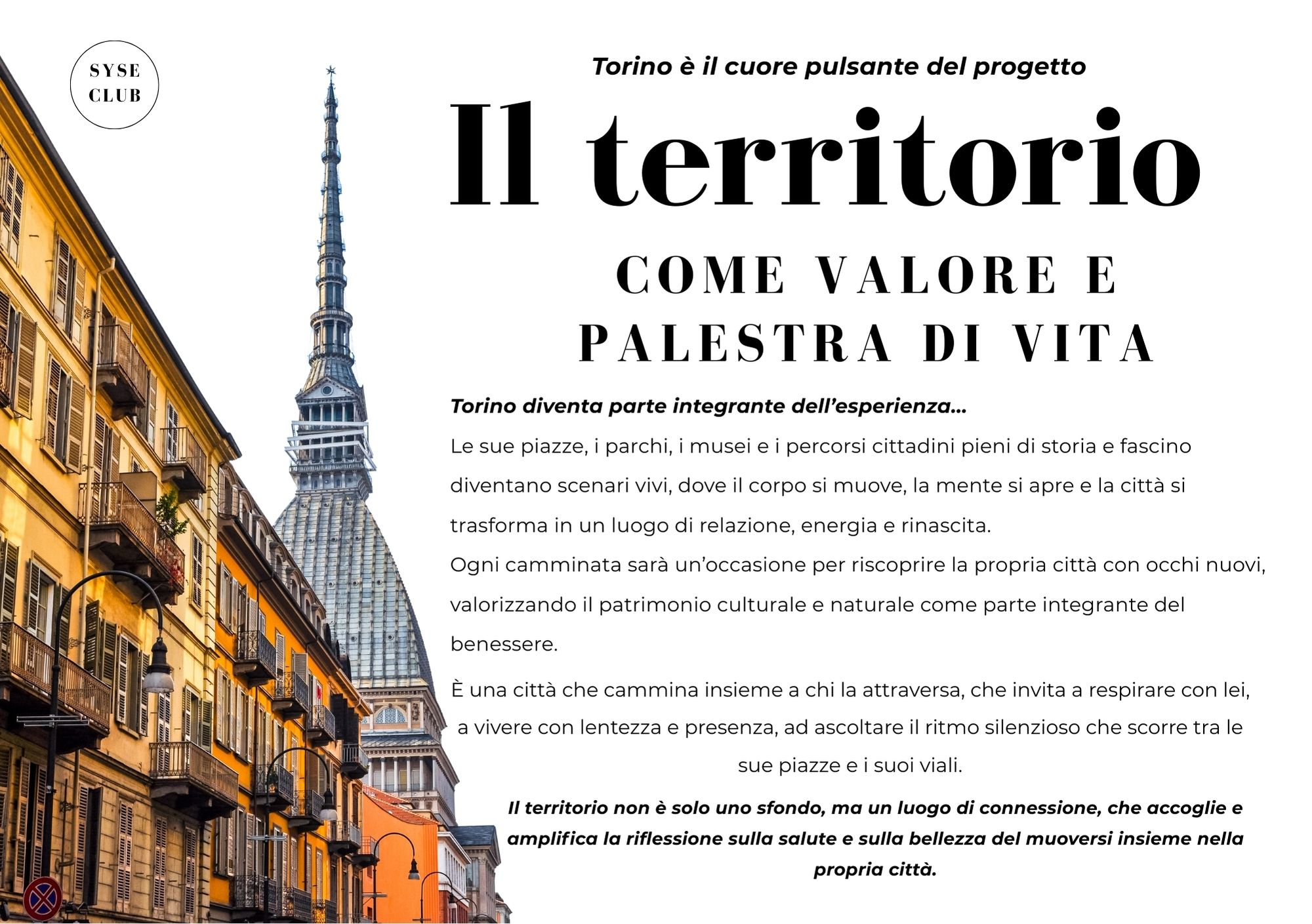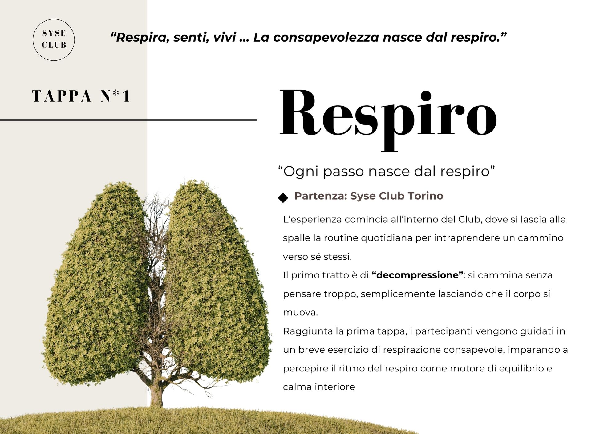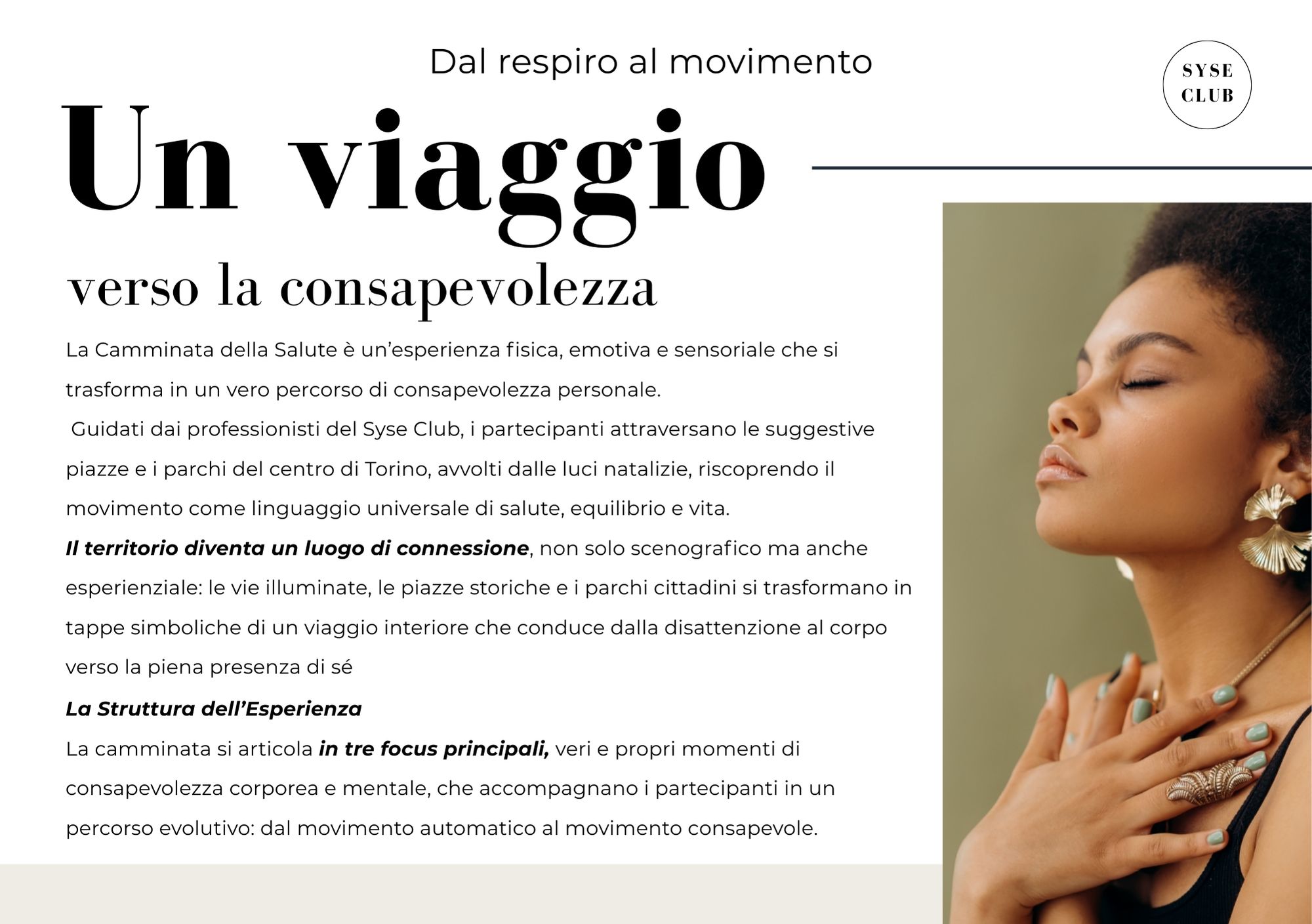 Ogni appuntamento prevede momenti di riscaldamento e defaticamento all’interno del Syse Club, da cui l’esperienza ha inizio e dove si conclude, creando un legame continuo tra il movimento, la riflessione e la comunità.