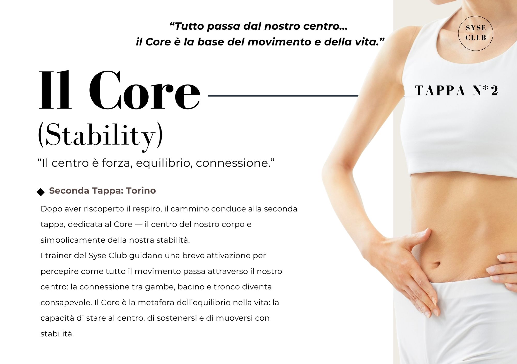 Dopo aver riscoperto il respiro, il cammino conduce alla seconda tappa, dedicata al Core, il centro del nostro corpo e simbolicamente della nostra stabilità.